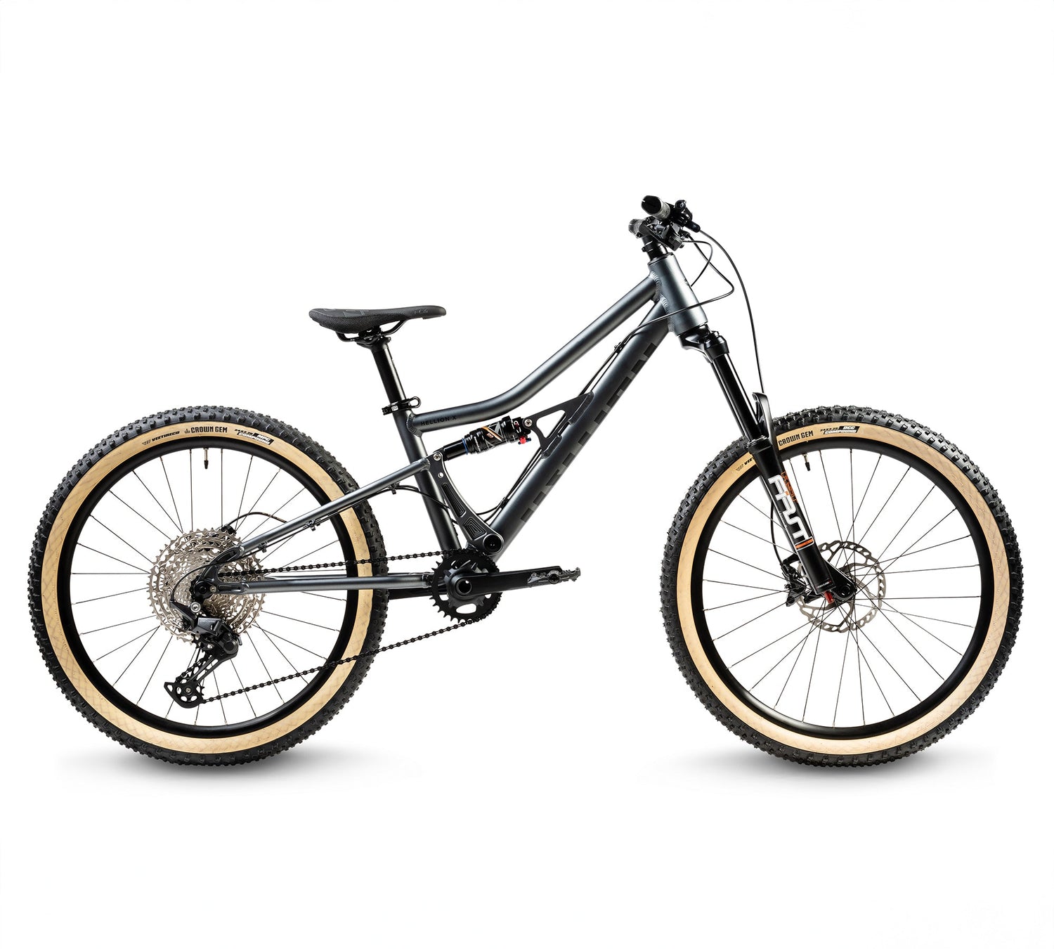 Das Hellion X24 verfügt über einen dreifach konifizierten, vollgefederten Aluminiumrahmen mit einem CNC-gefrästen Kettenstrebenjoch, einen 100-mm-DNM-Dämpfer mit einstellbarer Federwegverlängerung auf bis zu 125 mm sowie eine 120-mm-Frontfederung für sanftes, kontrolliertes Trail-Feedback. Seine lange, tiefe und flache Geometrie sorgt für Stabilität, Selbstvertrauen und ein verspieltes Handling. Ein Narrow-Wide-Kettenblatt, geschmiedete Kurbeln und SDG-Junior-Touchpoints verbessern Leistung und Kontrolle. Mit der RST F1rst-Gabel, die einstellbare Luftfederung sowie Druck- und Zugstufendämpfung bietet, ist das Hellion X24 ideal für junge Fahrer, die ihre Fähigkeiten ausbauen und anspruchsvolle Trails erobern wollen.